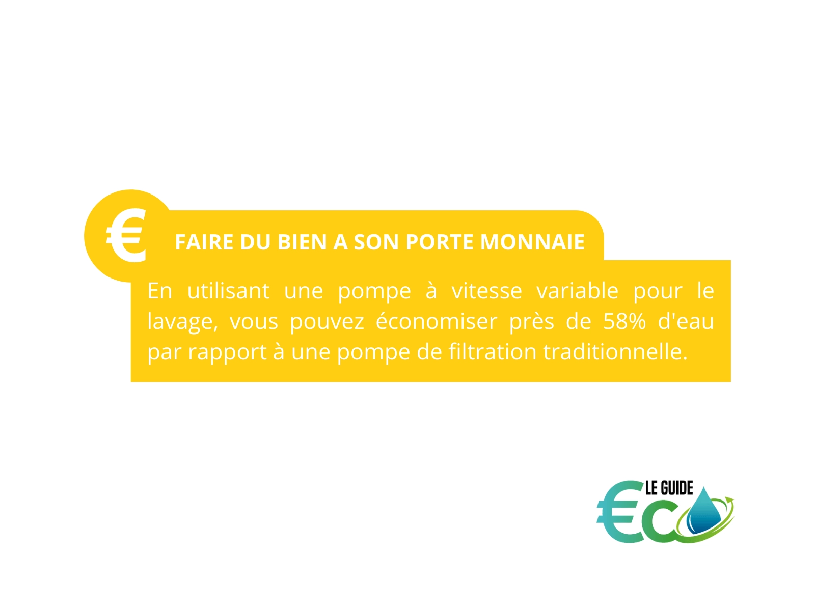 La pompe à vitesse variable améliore l'efficacité du nettoyage du filtre et en même temps, réduit la durée de ce processus. Lorsqu'elle est en mode lavage, la vitesse de nettoyage fluctuera entre une vitesse modérée à faible.