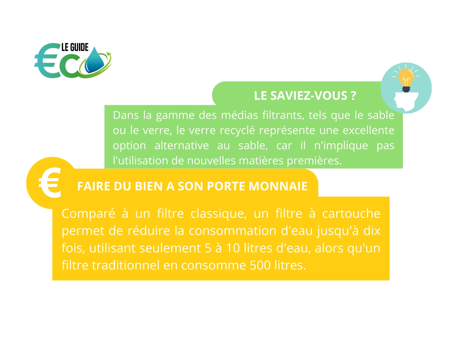 Le processus de nettoyage du filtre peut consommer beaucoup d'eau, qui est généralement expulsée hors de la piscine. Après un cycle de lavage du filtre, il est possible de laisser l'eau décanter et de l'utiliser ensuite, par exemple pour l'arrosage. Cependant, il existe une option plus simple à mettre en place. Les filtres à sable peuvent être complétés par un filtre spécifique conçu pour réintroduire l'eau de lavage dans la piscine, après avoir filtré les impuretés. Cette méthode permet d'éviter le besoin de rajouter de l'eau dans la piscine durant la saison, et répond également aux contraintes environnementales qui interdisent le remplissage des piscines et le rejet des eaux dans les égouts ou la nature.