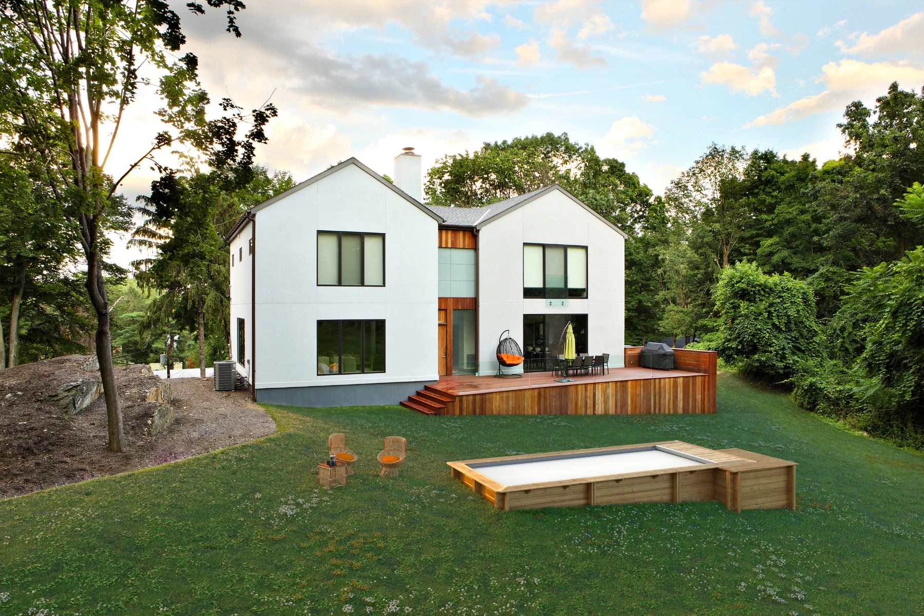 Remblayer les côtés de la piscine en bois enterrée avec de la terre et du gazon pour l'intégrer dans le paysage.