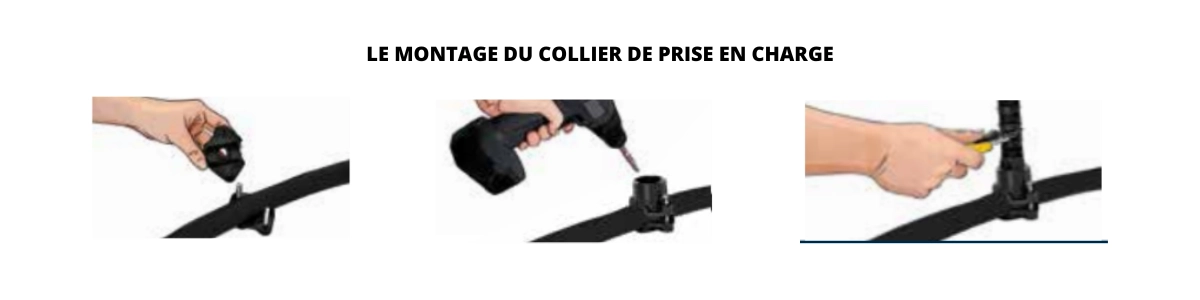 Mettre la partie inférieure du collier sous le tuyau. Placer le joint d’étanchéité dans le logement prévu de la partie supérieure du collier. Serrer l’ensemble du collier avec les vis fournies.