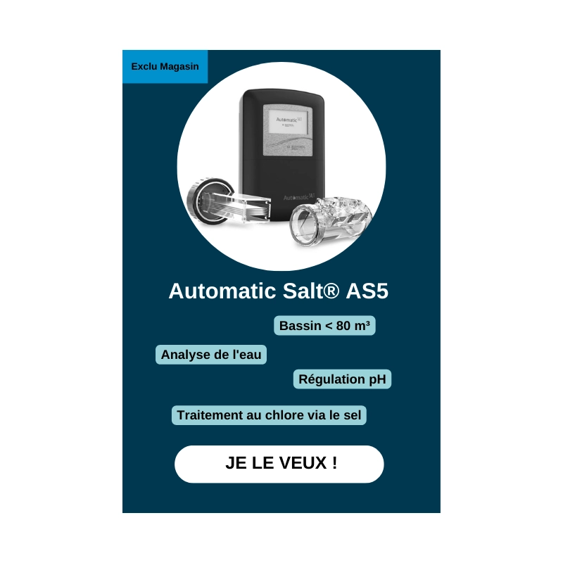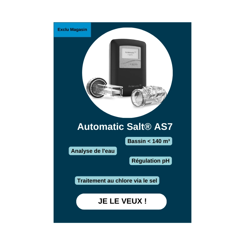 Cette solution offre un traitement automatique au sel pour les piscines allant jusqu'à 80 m³ pour Automatic SALT AS5 et jusqu'à 140 m³ pour Automatic SALT AS7.
