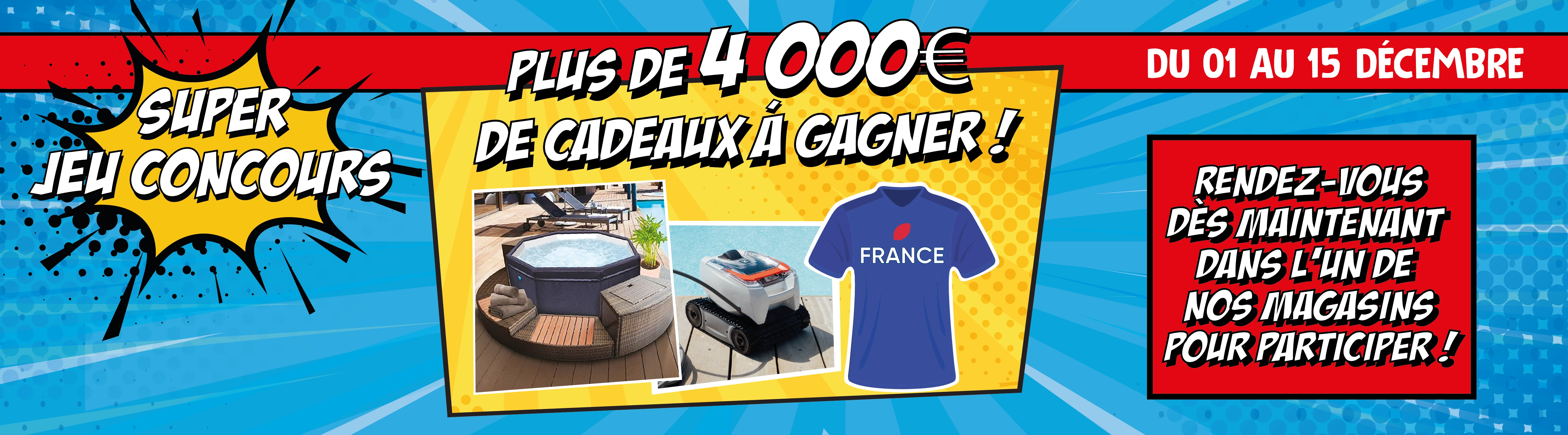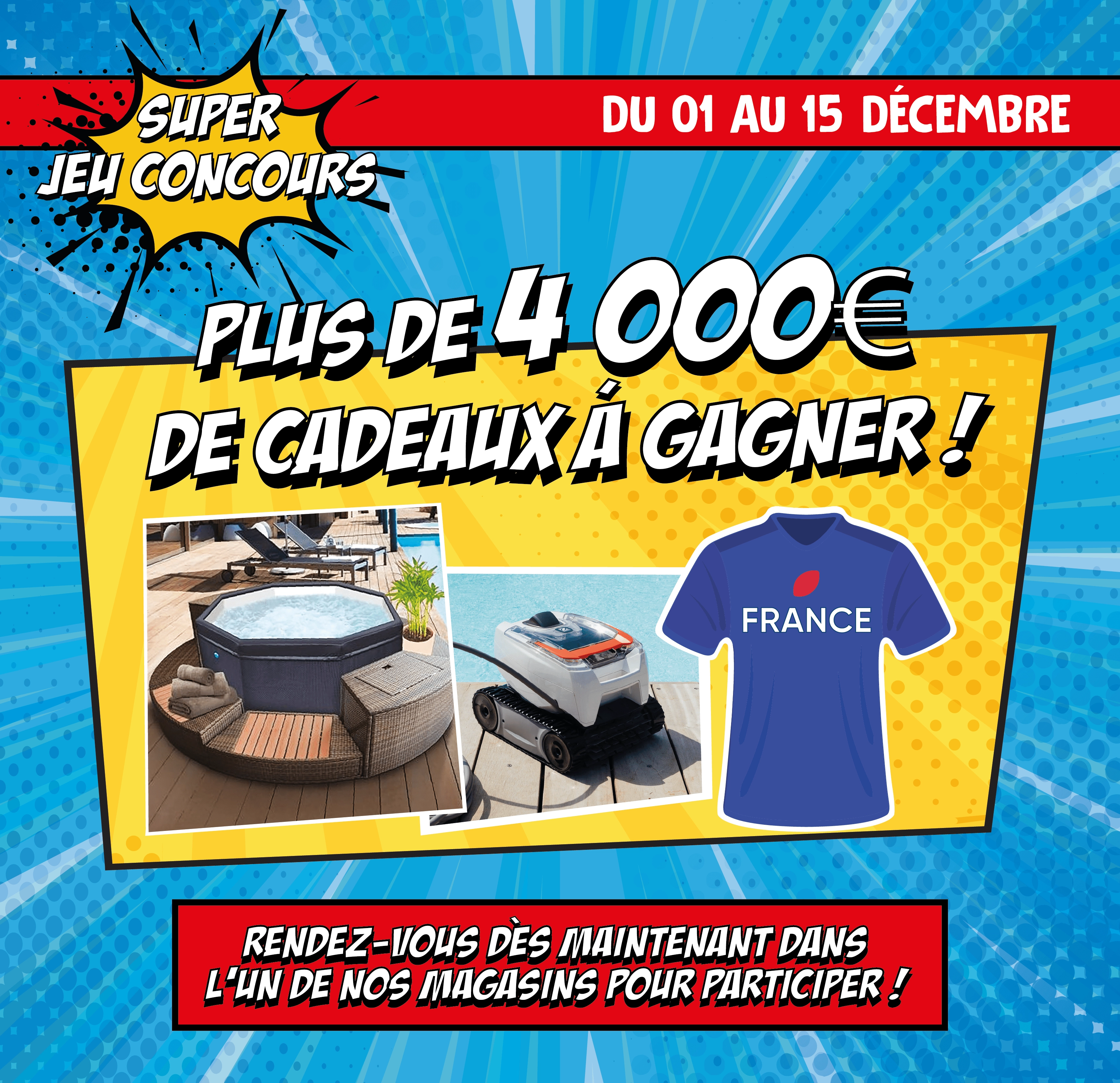 Tentez de remporter l'un de nos lots mis en jeu : spa octopus, robot de piscine, maillots officiel de l'équipe de France, bon d'achat et des goodies !